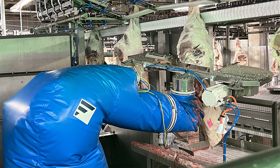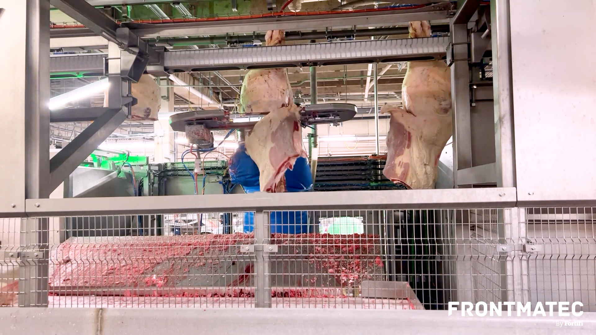 The automation system calculates the optimized pattern desired by the customer and sends it to the robot. A band saw, maintained by the robot, is then moved into the hindquarter to cut it into two pieces. The loin falls on the conveyor and goes to the loin line, while the round continues on the main chain.